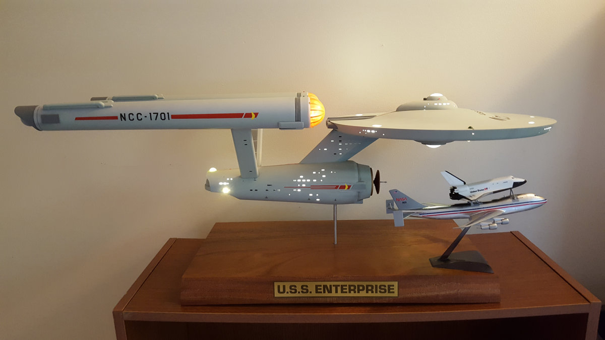 This was my attempt to build a truly spectacular nightlight, the Round2/Polar Lights 1/350th scale U.S.S. Enterprise from the the original television series. This is a very large model, approximately 30 inches long when completed. You can see it above, with a similarly scaled space shuttle Enterprise (actually a bit large, at 1/288th scale). I bought a LOT of stuff to properly light and paint this beast, making it easily the most expensive lamp in our house.