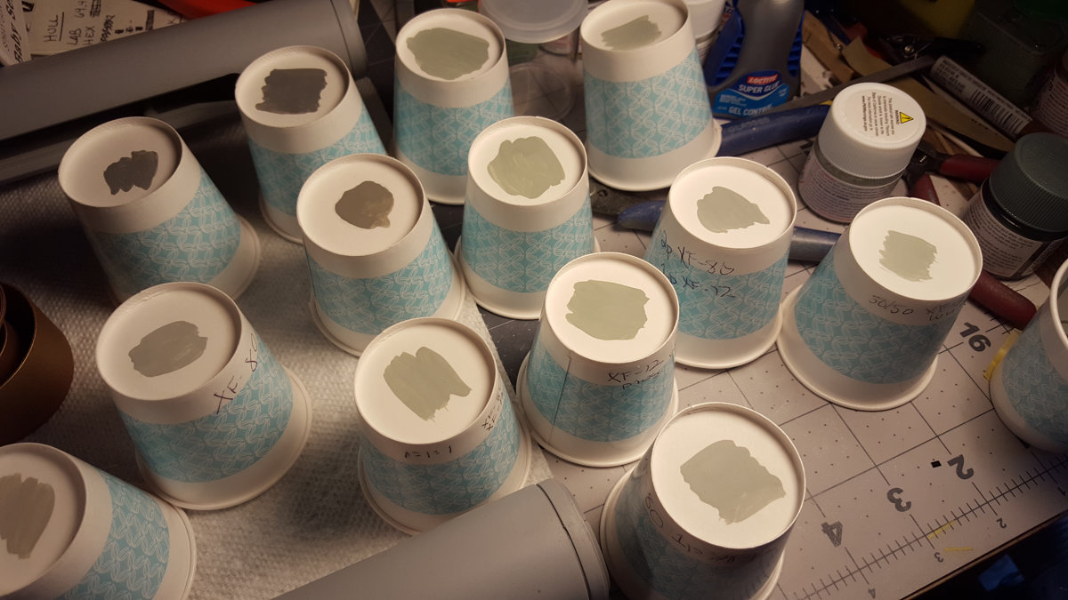 The big 'E' is a very accurate kit, and I wantd the color to be accurate, as well. Fortunately, the Smithsonian recently did a high quality restoration of the original Enterprise model, and one of the restorers was also part of this kit's design team at Round 2. He has graciously shared his findings with the rest of the modelbuilding community, (part of the restoration team even spoke at a panel at Wonderfest, which I attended) so there is no shortage of good information about the model. I did omit a couple details: the paint anomalies on the top of the primary hull (greener tint and 'rust ring'), which I feel were unintended discolorations incurred during the life of the model, and the colorful hull markings on the bottom of the secondary hull (which I accidently wiped out while masking the hull stripes and decided to simply ignore, since they are never visible during the pre-restoration series and cannot be seen unless you crawl on the floor). This photo is me trying to determine the best hull paint mix. The actual hull color is a greenish grey, very close to the color of a vintage Japanese Zero fighter from early WW2.