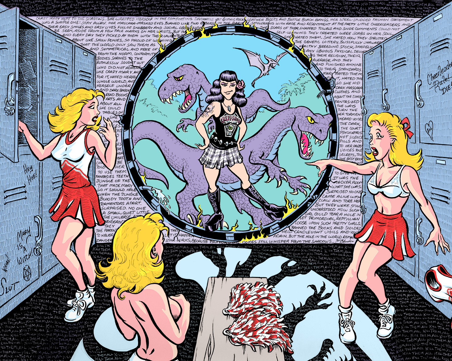 "Crazy Mary kept to the shadows. She wrapped herself in the comforting darkness of gothic rock, leather boots and bottle black bangs. Her steel-studded fashion statement was a simple one: stay away. Her mascara-masked eyes burned like two embers in the dark, smoldering with rage and resentment at the pretty little cheerleaders and their easy smiles and easy lives full of snobbery and social obsession. The scars of their snapped towels and snide comments could not be seen, aside from a few pale marks on her wrists, but the self-loathing they created were scabs on her soul, and every day they picked at them with their laughter. She hated them. She hated how they strutted about like show ponies, so proud of winning the genetic lottery, blissfully unaware that the world only saw them as healthy breeding stock, shapely and symmetrical and free of any obvious physical deviation from the norm. Conformity was their religion, their bodies shrines to the average, and they ruthlessly sought out and punished anyone who did not adhere to their standards. Like Crazy Mary. And Mary hated them for it, hated herself for it, hated the whole world, and so she hid herself under dark mascara and dark baggy clothes and read books about the dark arts and fantasized about all the ways she could turn the tables on her tormentors. She heard voices in the dark, voices the court appointed psychiatrist could not silence with pills and promises to her parents. The voices told her secrets, told her where the best books could be found, told her how to use them to give her fantasies teeth. It was the jungle of the locker room that made Mary what she was, and so it should have surprised no one when the jungle came alive with bloody tooth and claw and tore her tormentors to shreds. But they were still surprised. No one understood how such a small, quiet little girl could tear a hole in the universe and let primordial, reptillian vengeance loose upon the once pretty girls of her high school. They banned the books and scolded the parents and sued the psychiatrist and stripped Mary of her comforting long bangs and leather clothes. They held candlelight vigils and vowed to never let it happen again. But the hole in the world remained, and danger still lurked in the locker room, because the dinosaurs live on in the DNA of the downtrodden, and primordial voices still whisper from the shadows. Whisper, and wait..."
