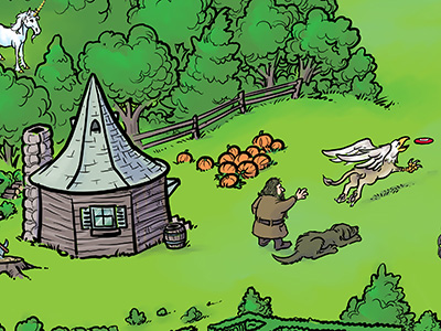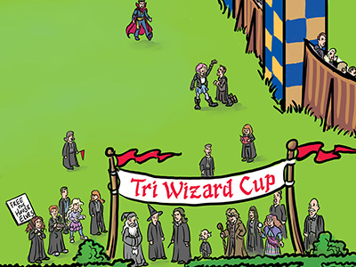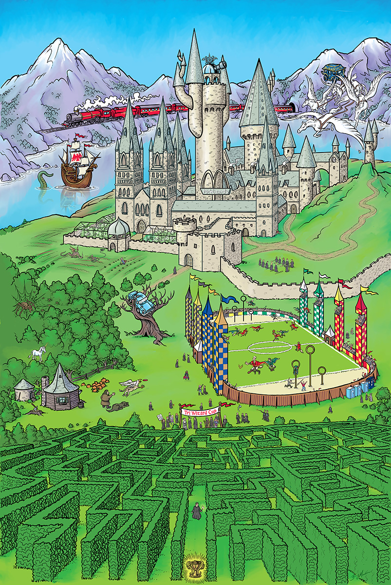 Harry Potter fan art. This was produced as background art for a plinko machine used at the Cincinnati Comic Expo, as part of their Harry Potter themed Geek Prom. This was a BIG piece of art with an enormous amount of detail in it. Most of the principal characters are present, along with a few other wandering wizards that I snuck in (including Gandalf and Dr. Strange). You can even see individual faces in the Quidditch match crowd.