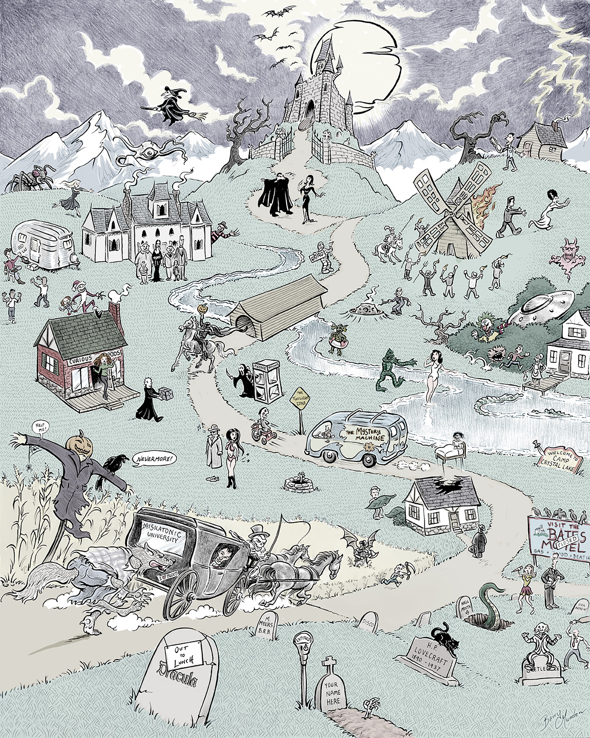 A tribute to the icons of horror. There are nearly fifty references to horror movies and tv shows in this drawing. Can you find them all? Pen and ink and pencil, 16"x20".
