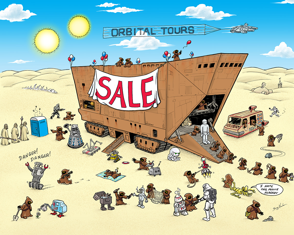 This illustration was created in pen and ink for a Star Wars themed art show. I photographed the linework before finishing it off with an ink wash and added digital color after the fact. 16"x20".