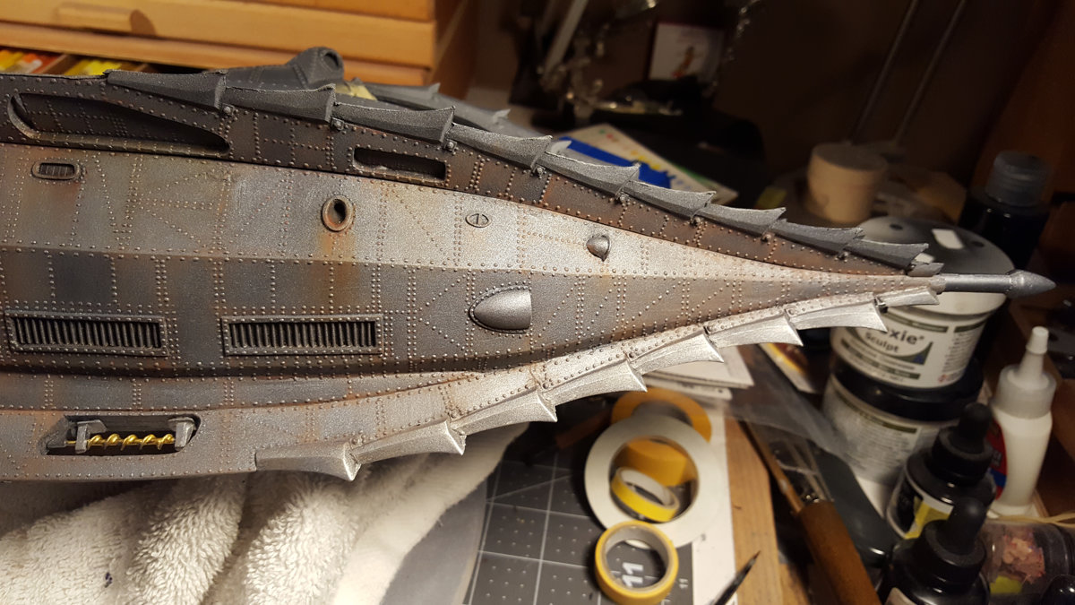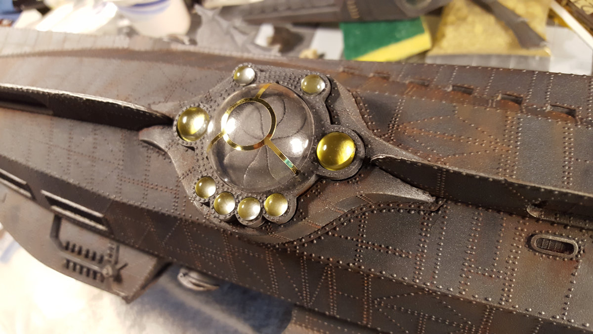 The movie Nautilus is a rust bucket, which is not a look I find very appealing. (The studio model was mostly brass) I opted for a less weathered iron with brass accents. The rust is mostly colored pencil and oil paint.