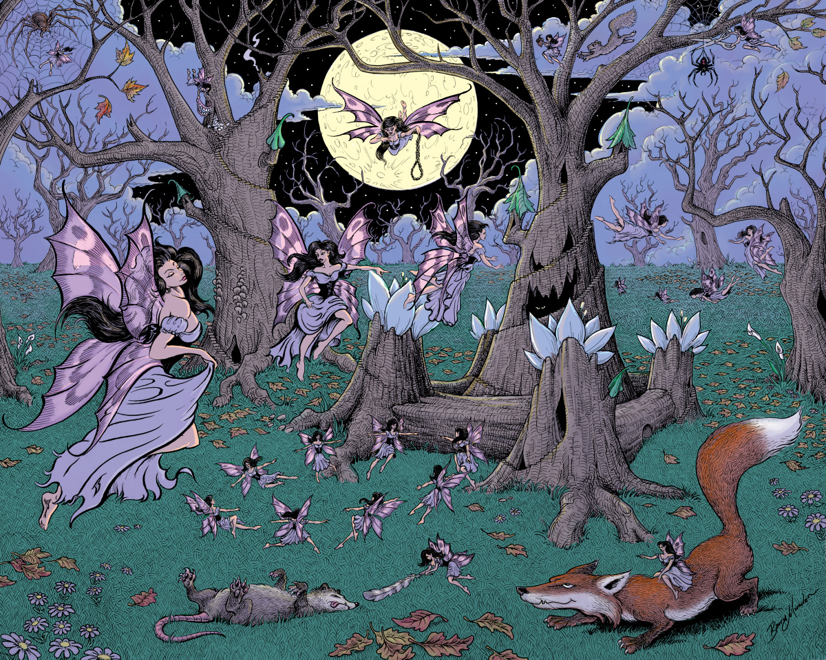 Night Fairies, 16"x20" Pen and Ink, Digital Color