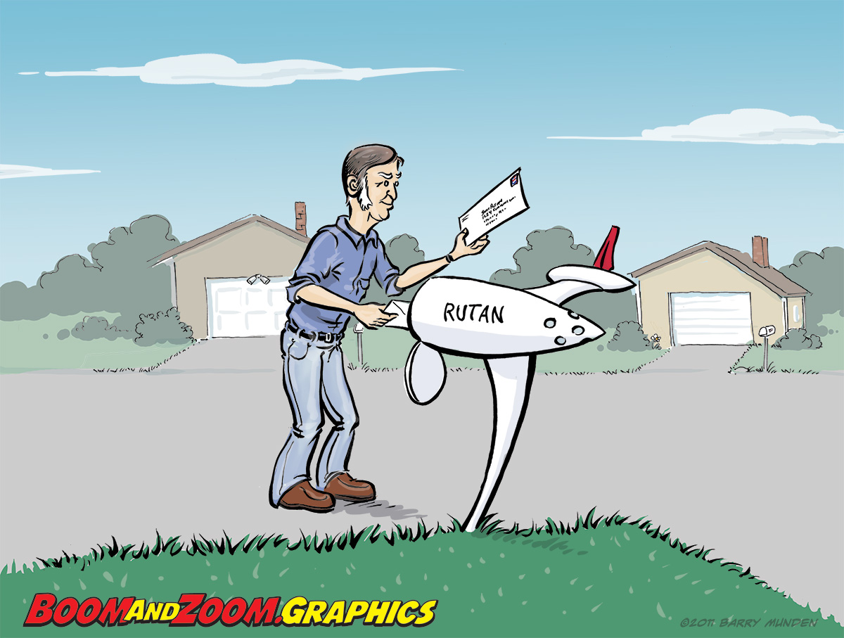 I created this cartoon for Martin Leeuwis' aviation cartoon anthology, "Going Up, Sir!". This cartoon may not make sense to someone outside of the general aviation community. It is a caricature of legendary aircraft designer, Burt Rutan, checking his mail. Burt has a reputation for designing unconventional looking airplanes (like Spaceship One), which is echoed by the strangely shaped mailbox. The original pen and ink version of this is hanging on Burt's wall.