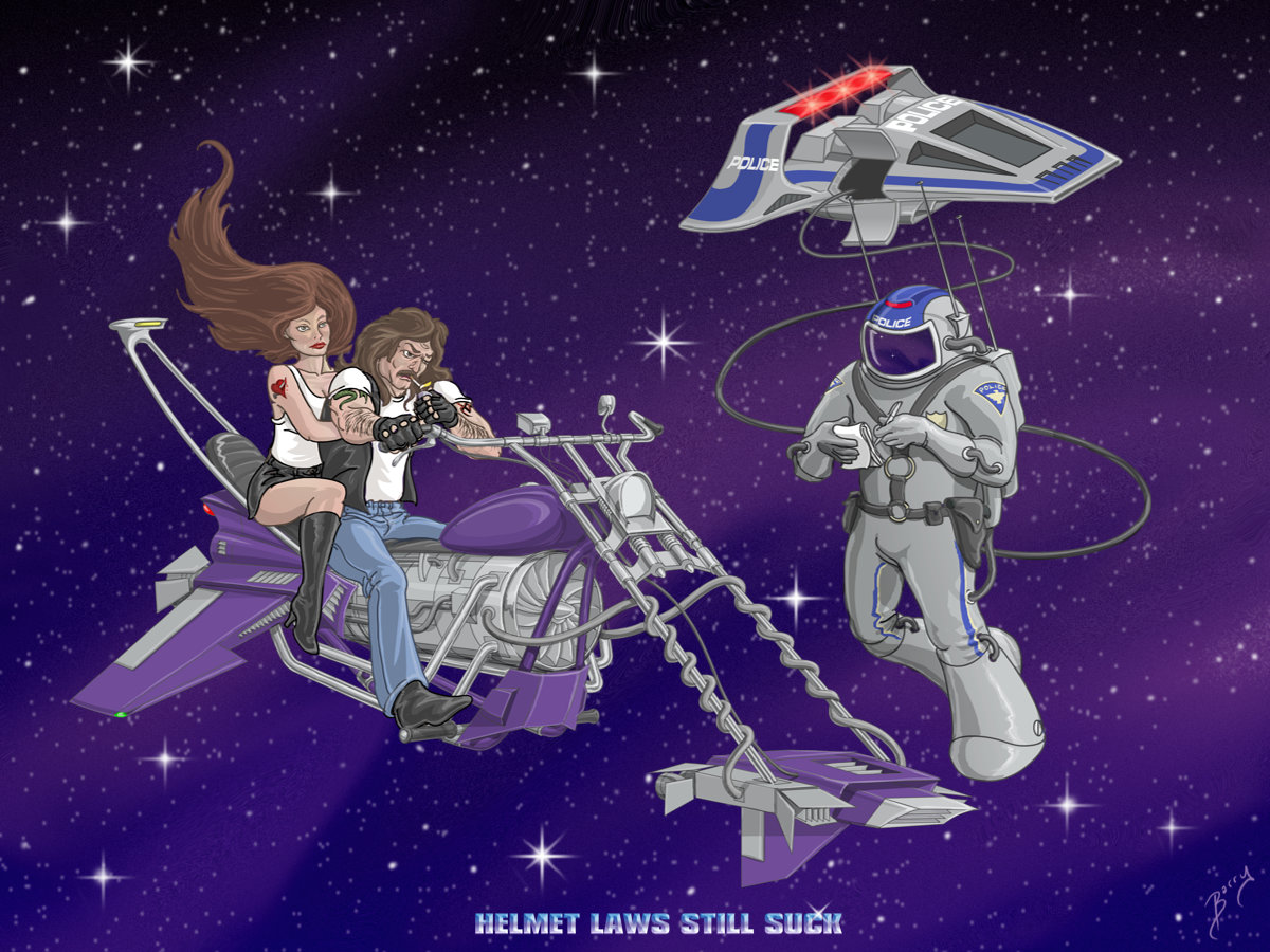 My goal for this project was to recreate an illustration of mine featuring a space cop pulling over a space biker for not wearing his helmet.