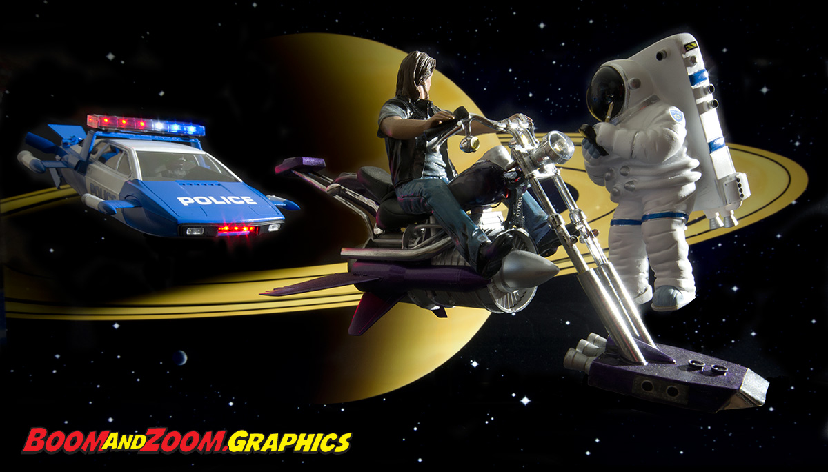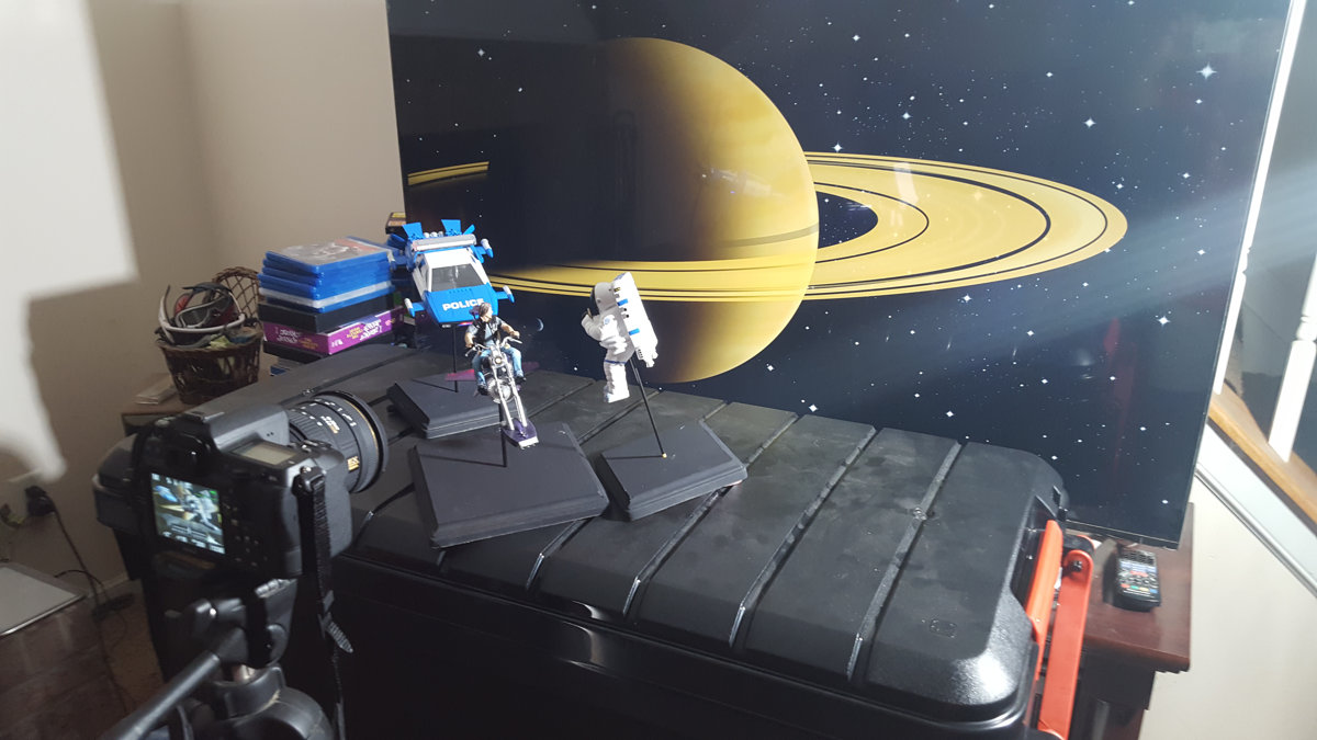 Finally, I needed a spacesuited cop. I found an astronaut cell phone holder which I was able to customize by liberating him from his base and adorning with various greeblies and decals (Like a psace police patch on his shoulder). The astronaut already came equipped with his own little cell phone...I simply needed to fabricate a tiny pen to make it look as if he was writing a ticket. I created some suitable background art and displayed it on my TV, which often doubles as a backdrop for my miniature photography sessions. I assembled the whole mess in front of it, lit the lights and snapped away.