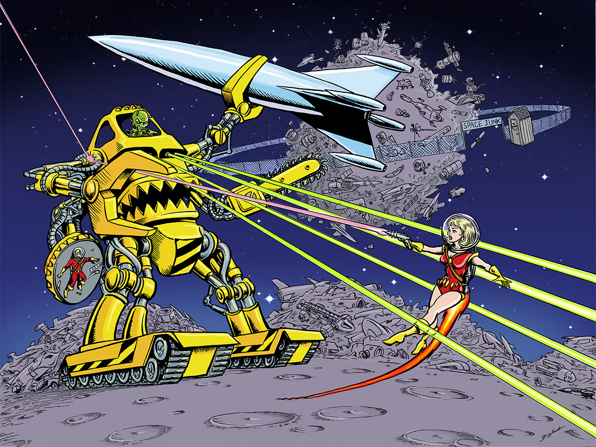 Pen and ink with digital color. There are lots of vintage spaceships in the junkyard. Can you find them all?