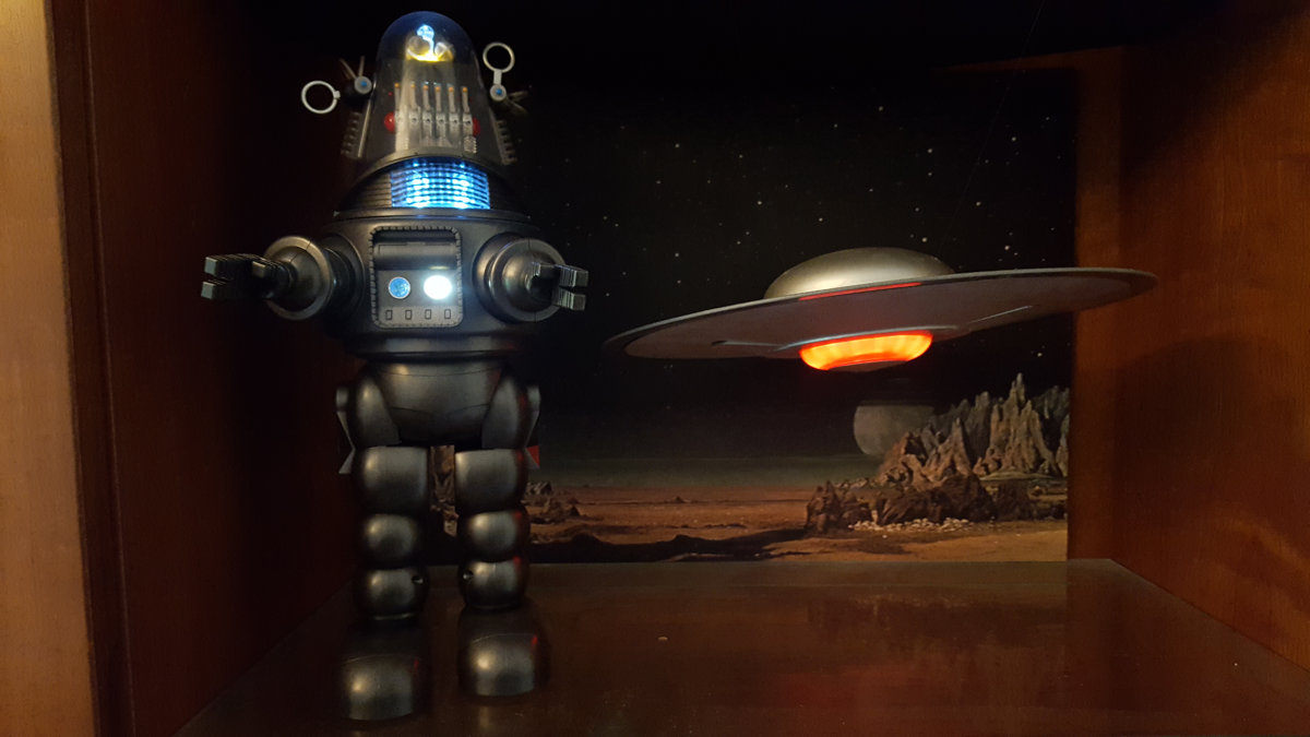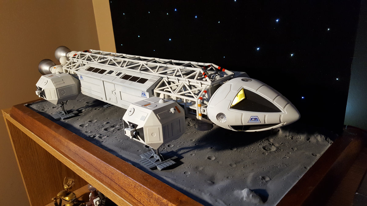 The Eagle, from Space 1999, represents the flip side of the vintage rocket. Its all-business look of exposed machinery and piping is the polar opposite of the sensuous lines and shiny metal of the 50's spaceship. The cratered moon surface of this display was created the same way they did it in the TV series, by flicking drops of water onto wet plaster of paris.
