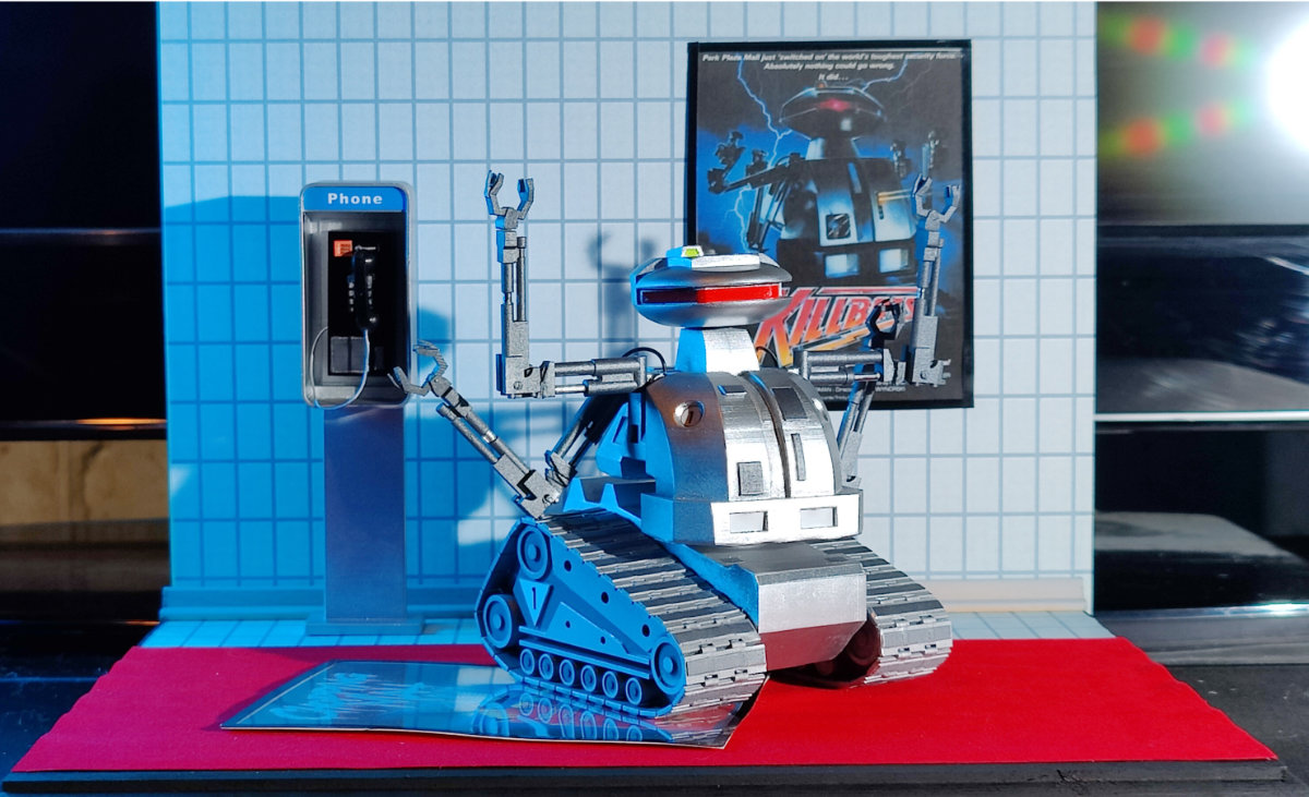 This is one of the killbots from the 80's cult classic, "Chopping Mall". The film was initially released under the more descriptive title "Killbots", which is why this particular bot is redecorating the mall. This model was 3D printed from files generously contributed by a friend. My biggest challenge was recreating the pay phone. Judging from the few models I found online, no one young enough to master 3-D modeling has ever actually seen a pay phone, so I had to make my own.
