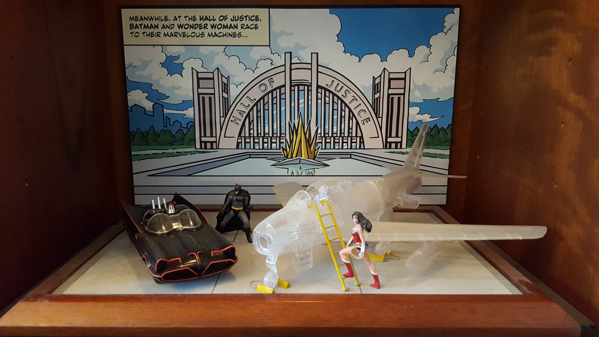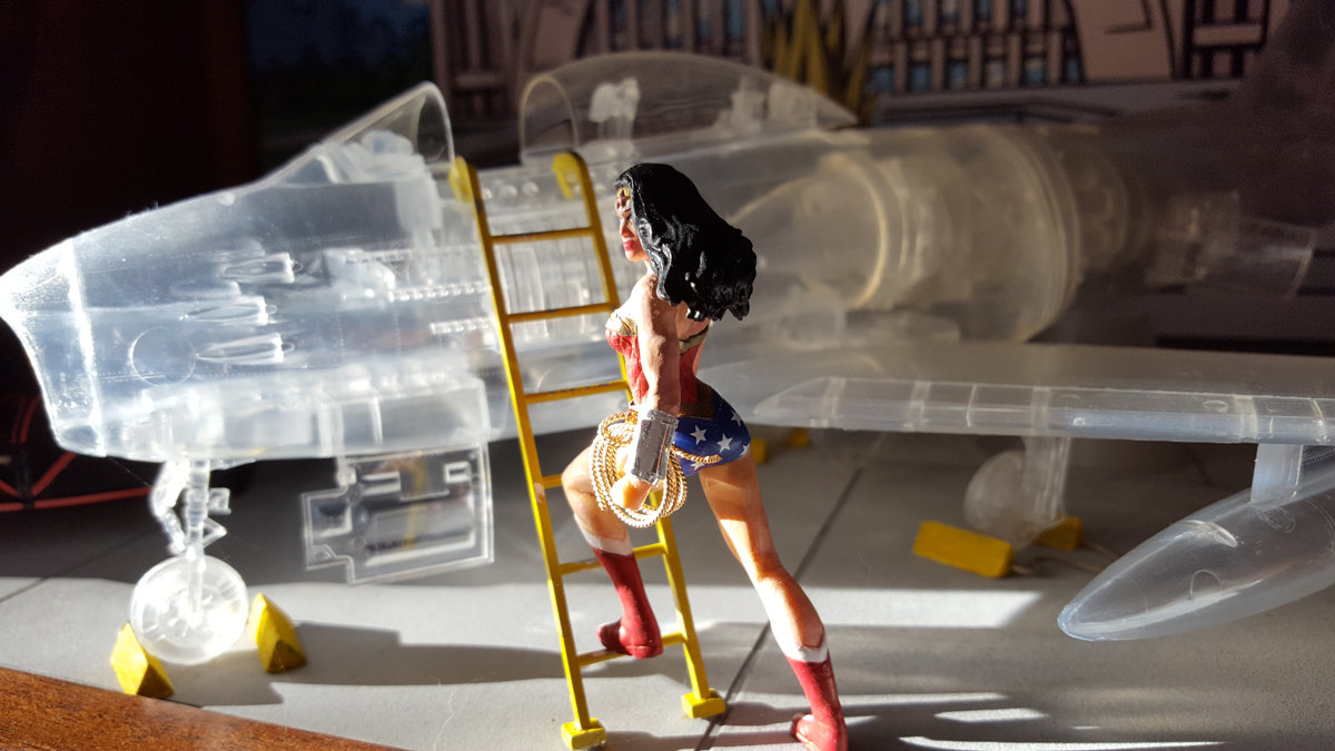 I had difficulty finding a classic Wonder Woman in this scale (approx 1/24), so I had to make do with a more modern version, which I carved and completely repainted to look like the more iconic Bronze Age Amazon. Her magic lasso was made from gold jewelry wire. Her star-spangled shorts were decorated using dry rub transfers. Her jet is a see-through Hasagawa 1/32 scale F-86 Sabre. I would have preferred an F-104, which more closely resembles her jet from the seventies, but see-through model jet kits of any kind are as rare as hens teeth, so I couldn't be choosy. Who really knows what her invisible jet looks like, anyway?