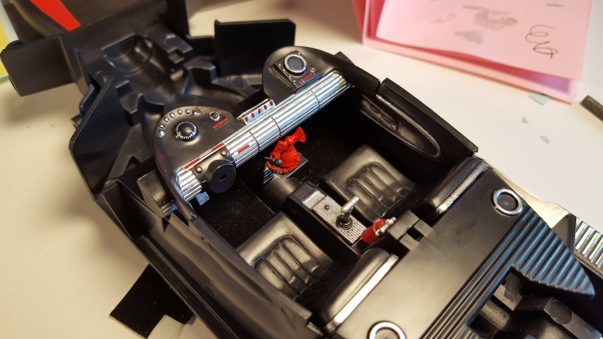 The batmobile model contains some interesting detail, including what may be one of the smallest things I've ever fabricated for a model: the phone cord for the batphone. It was created by wrapping fine copper wire around a slightly larger wire.