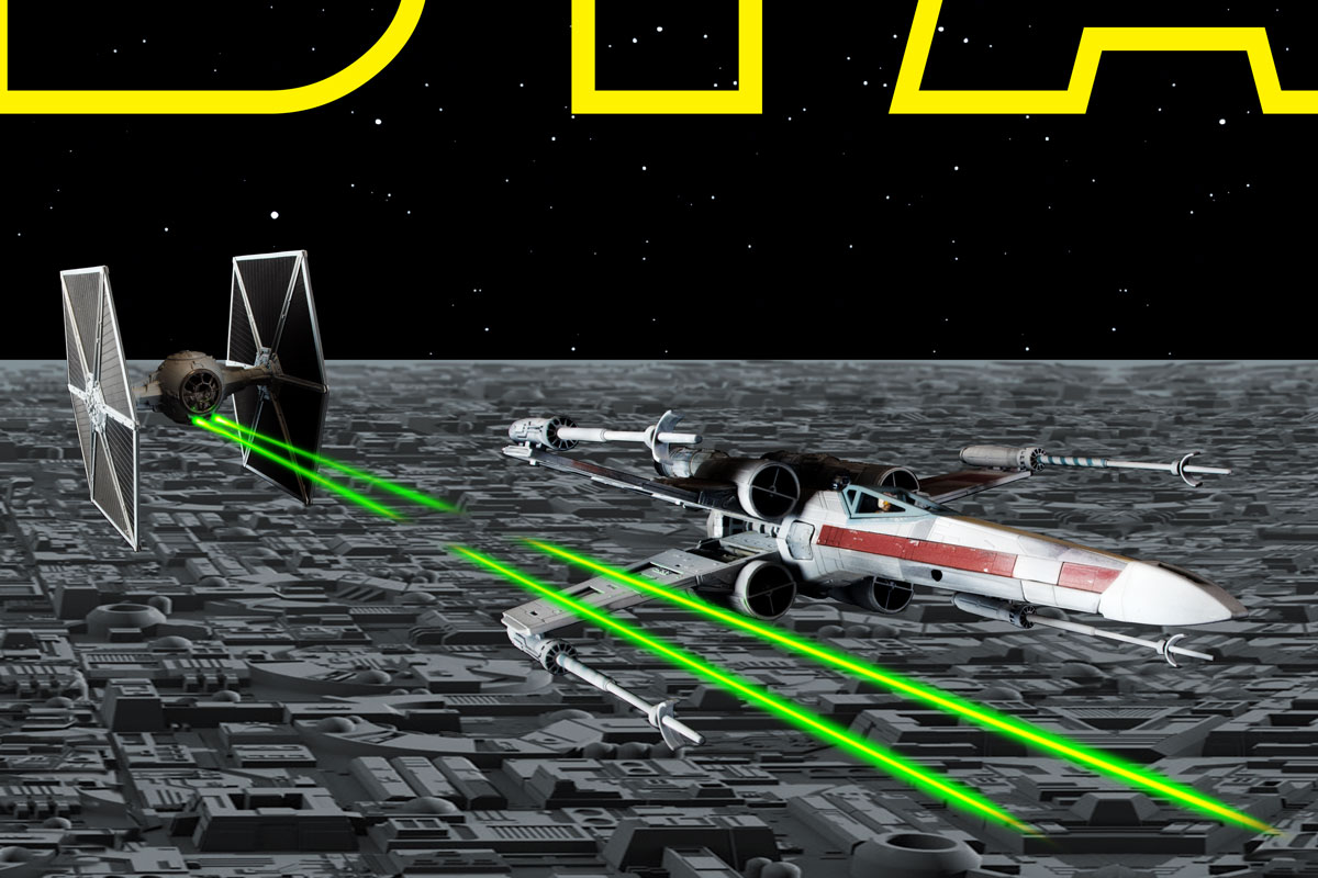 In order to create the exhibit's backdrop, I built several Star Wars model kits and photographed them to provide high resolution images which I could use to composite the final artwork.