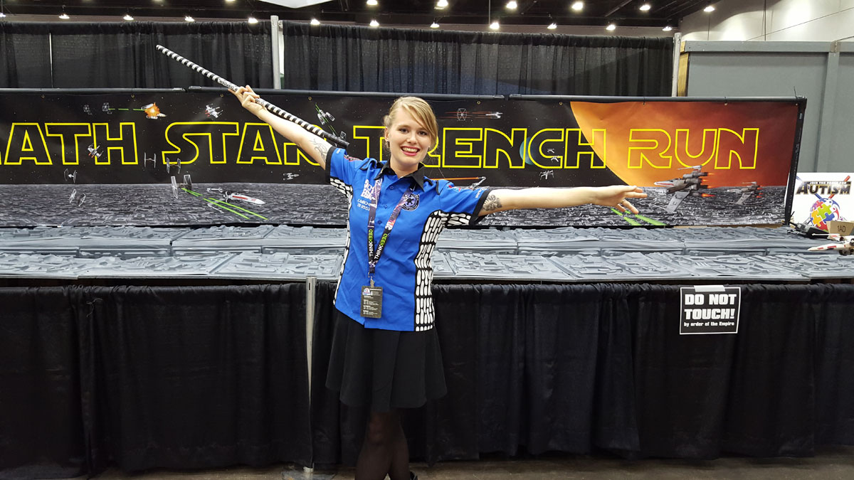 The trench itself was constructed from wood and PVC pipe, and designed to break down and fold up for transport on three custom built carts. The surface detail of the Death Star was vacuformed from plastic in two foot square tiles, which were screwed to the wooden frame. The electronic sensors and audio system were contributed by Greg Spata, who likes to build robots in his spare time.