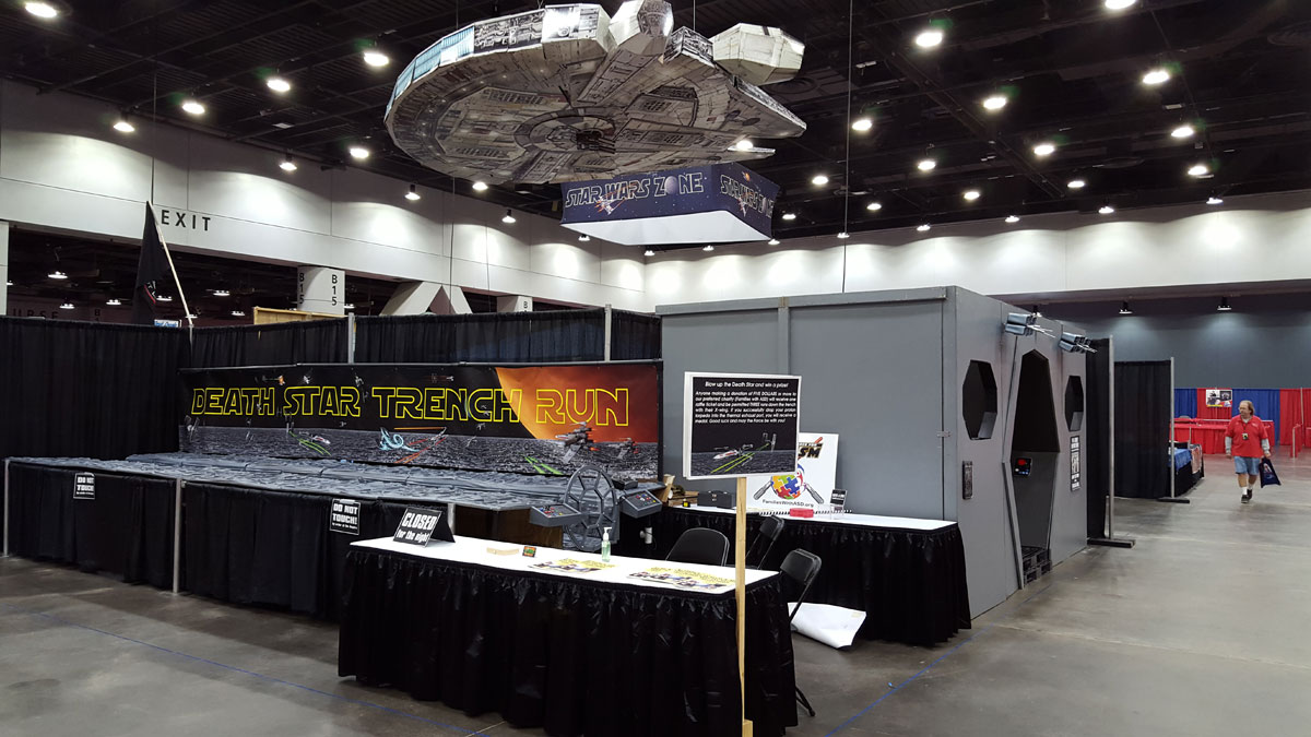 The final backdrop was 24 feet long, and the largest photoshop file I've ever created...over 1 Gigabyte! It depicts the Battle of Yavin in the background. Here are a couple close-ups of the action...