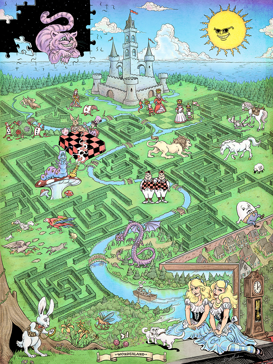 Through the Looking Glass. This is a map of Alice's Wonderland. Games figure heavily in the themes of both of Lewis Carrol's books, so I built this picture around that theme. Wonderland is laid out like a chessboard, as described in Through the Looking Glass, and the art itself is a functional maze. One path will take you through the events of the first book, and another will take you through the second book. Both end at an Escher-inspired castle, because down is up and up is down in Wonderland. The boat in the river is a nod to the origins of the books, which began life as tales told by Charles Dodgson (Lewis Carrol) to young Alice Liddell on an afternoon boat ride. Digital art, 18x24.