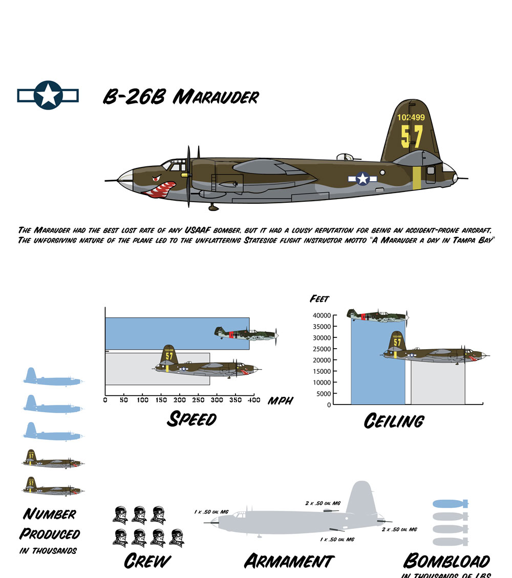 Despite nicknames like the "Widowmaker", earned due to the tricky landing and takeoff behavior of its early models, the Marauder had the lowest loss rate of any combat aircraft of WWII. Its small wings gave it poor low speed behavior (it landed at about the same speed as a modern jumbo jet), and it never was very popular with its crews. It was soon replaced by the Mitchell in the Pacific, where the improvised island airfields demanded shorter takeoff runs.