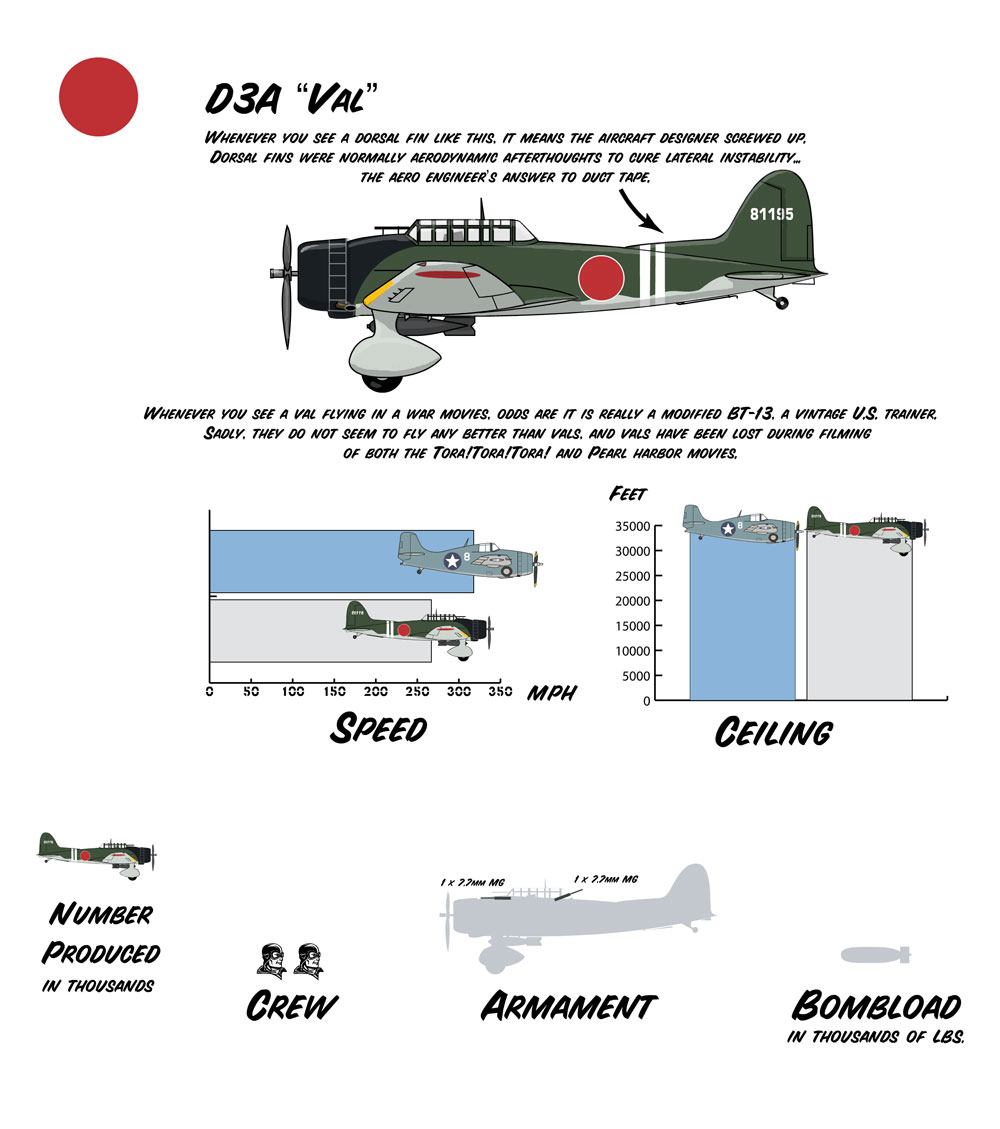 The Val was Japan's answer to the Stuka dive bomber, and sank more Allied ships than any other Axis airplane. Like the Stuka, though, it was slow and vulnerable, and eventually suffered badly at the hands of Allied fighters. Relegated to kamikaze duty near the end of the war, it reportedly suffered a high loss rate even in that role. (Didn't most kamikazes suffer pretty high loss rates? Did somebody lose one twice or something?)