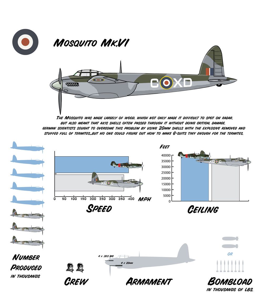 The Mosquito was one of the most versatile and cost-effective aircraft of the war, serving in almost every conceivable combat role. It's high speed and wooden construction meant that termites were a larger threat to its pilots than Luftwaffe interceptors.