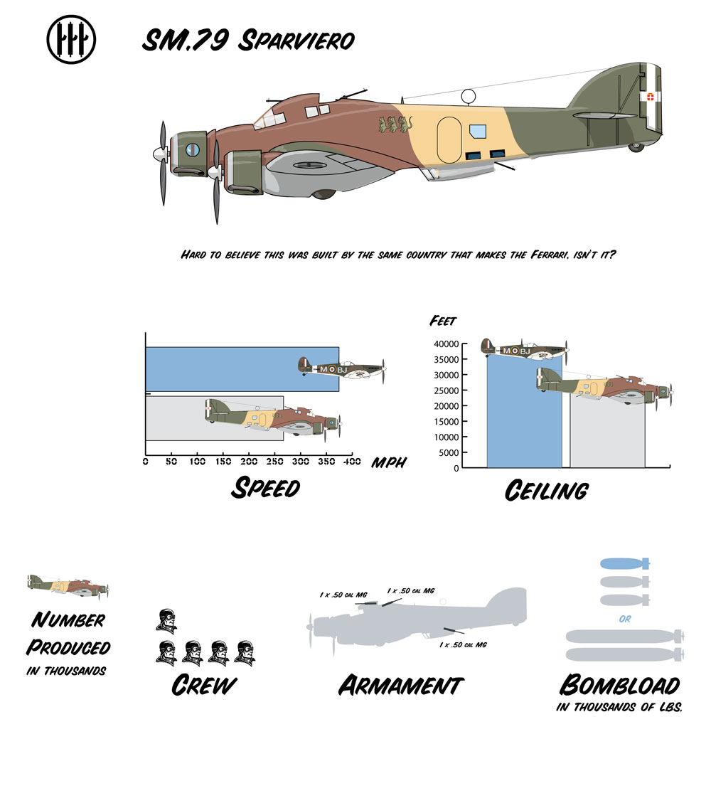 The Sparviero, or Sparrowhawk (the "hunchback" to pilots), first saw action in the Spanish Civil War and continued in service as Italy's principal bomber throughout the war. They were highly successful in the Mediterranean theater as torpedo bombers.