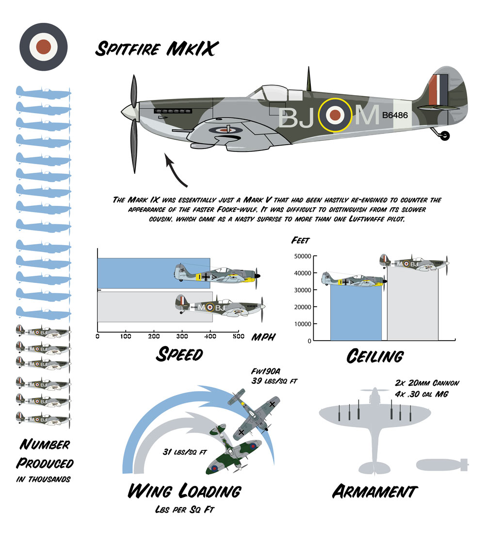 The Spitfire was such a well-designed plane that it continued in front line service throughout the war. Whenever the plane seemed in danger of becoming outdated, the British simply dropped a newer engine in it, and it was back on top again. The Spit IX is a good example of this, being simply a Spitfire Mk.V that was hastily re-engined in response to the luftwaffe's introduction of the Fw190.