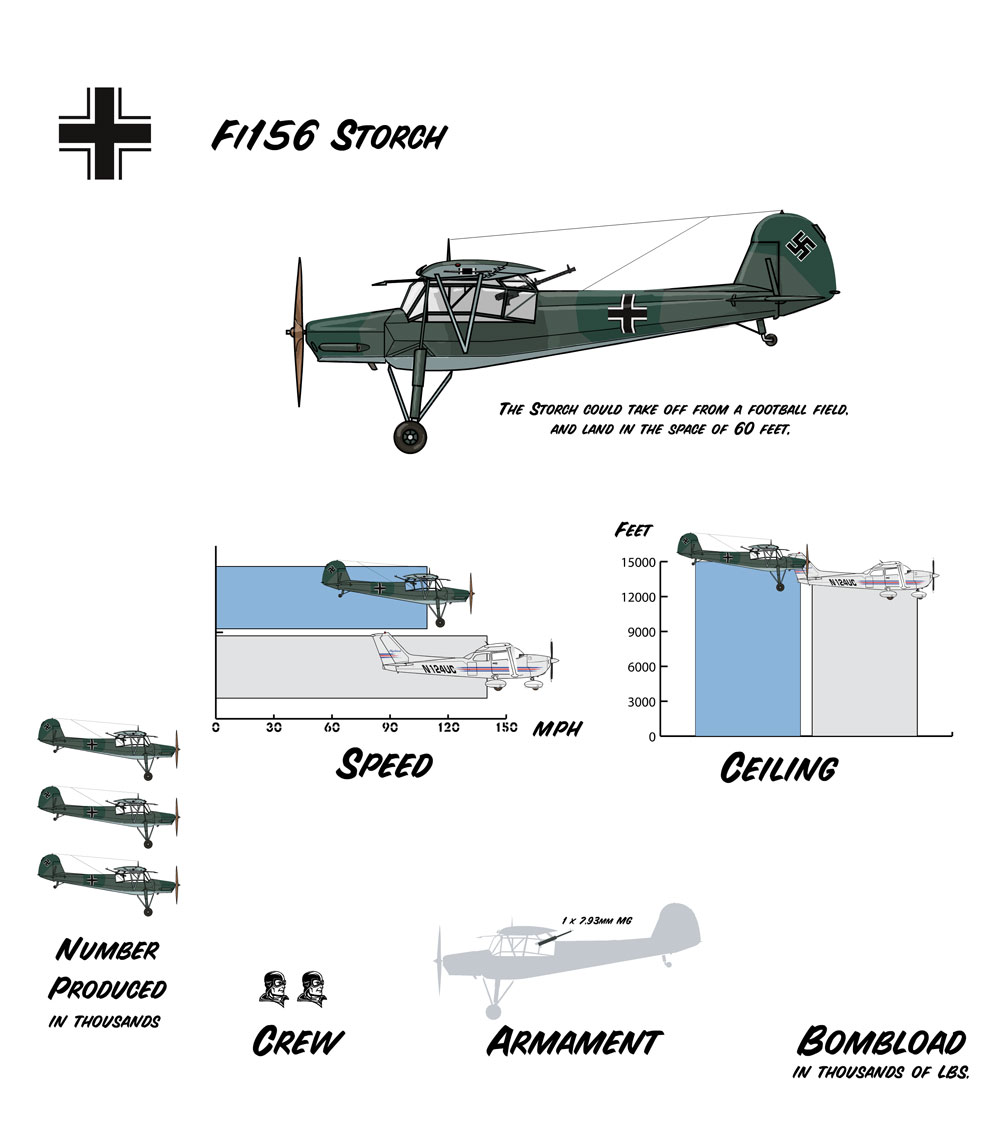 The Storch, or "stork", was so named for its shock-absorbing landing gear, which hung down an additional 18 inches in flight. It may have looked goofy, but it could land anywhere, and earned fame for the rescue of the deposed dictator Benito Mussolini, whose legendary people skills had led to his becoming surrounded by his own troops on a boulder-strewn mountaintop. Many postwar homebuilt aircraft designs have imitated the Storch in order to duplicate its short take-off and landing abilities.
