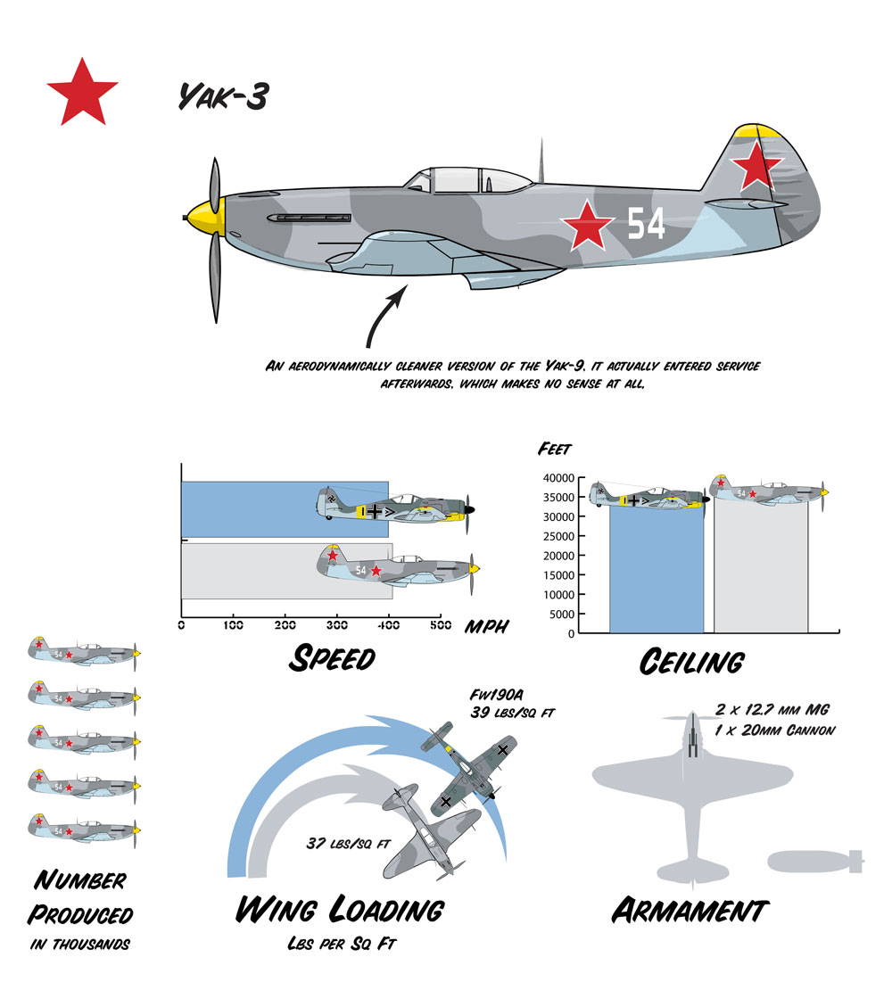 The Yak-3 was a smaller, lighter version of the Yak-1. It was an outstanding performer and outclassed all comers at low level. It confusingly did not appear in service until AFTER the Yak-9. The VVS always had a penchant for confusing aircraft designations, but the Yak family seems to have been more muddled than most, becoming more and more screwy until everyone just gave up trying to figure it all out and started building Migs instead.