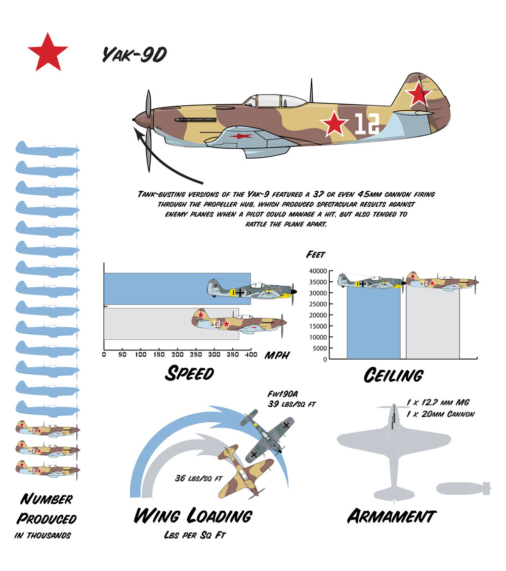 The Yak-9 was the most prolific version of the Yak, and served as the mainstay of the Soviet fighter force during WW2. It was a solid low-altitude performer based on the Yak-7 (a long-range version of the Yak-1). Later models of the Yak-9 fought in Korea. There were over 22 versions of the Yak-9 carrying two different wings, five different engines and seven types of armament...perhaps part of a plot to confuse future capitalist historians.